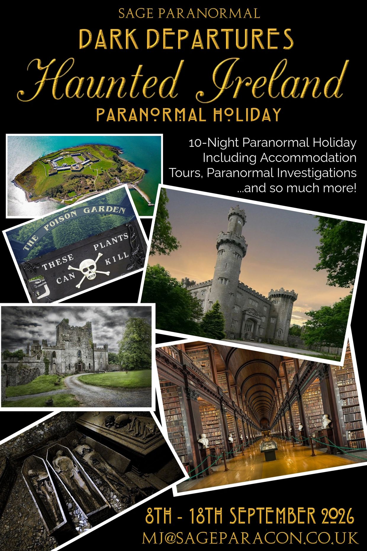 On day nine, experience a private overnight paranormal investigation at a historic Gaol, where the spirits of long-departed prisoners are said to linger. The next day, take a haunted hike to Montpelier Hill’s Hellfire Club, infamous for dark rituals and even darker legends—will you encounter the infamous banshee of Montpelier Hill? Later, visit Malahide Castle for a tour and explore the magical grounds in search of fae.